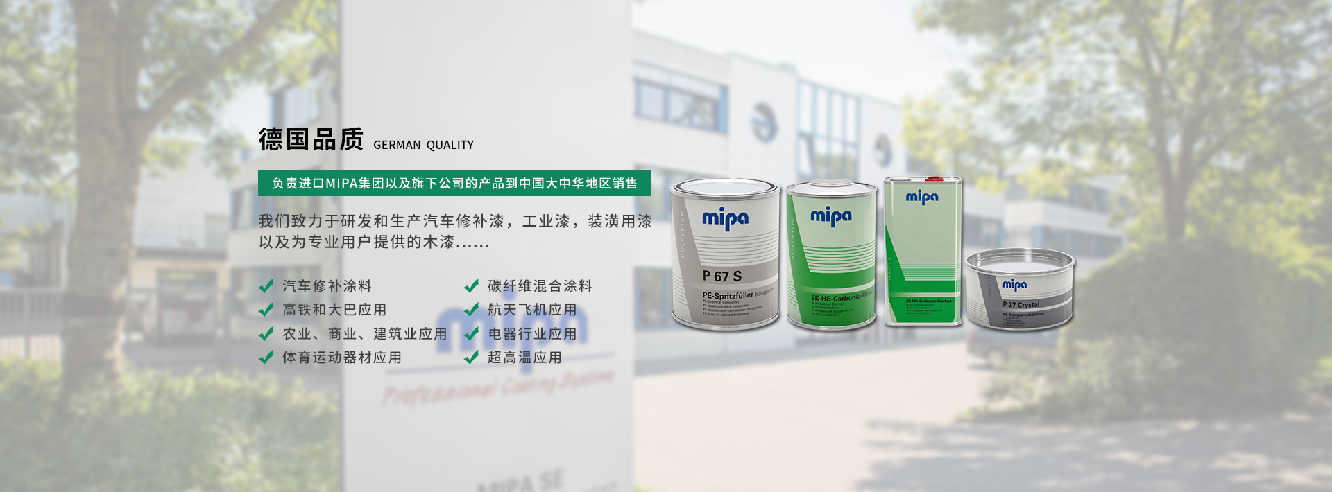 米帕(深圳)涂料有限公司       米帕(深圳)涂料有限公司是MIPA SE的中國(guó)分公司,成立于2013年,目前公司位于深圳市龍崗區(qū),主要負(fù)責(zé)進(jìn)口MIPA集團(tuán)的產(chǎn)品到中國(guó)大陸銷(xiāo)售。MIPA集團(tuán)總部坐落于德國(guó)艾森巴赫,是一家快速發(fā)展的中型企業(yè),主要生產(chǎn)各類(lèi)清漆和油漆。我們?cè)诘聡?guó)以及境外擁有超過(guò)8個(gè)以上的生產(chǎn)基地,我們致力于研發(fā)和生產(chǎn)汽車(chē)修補(bǔ)漆,工業(yè)漆,裝潢用漆,以及為專(zhuān)業(yè)用戶(hù)提供的木漆。Mipa 集團(tuán)目前全球員工人數(shù)已超過(guò)1200名,我們的員工正在為全球各大洲超過(guò)100多個(gè)國(guó)家的子公司和客戶(hù)群體運(yùn)送產(chǎn)品。